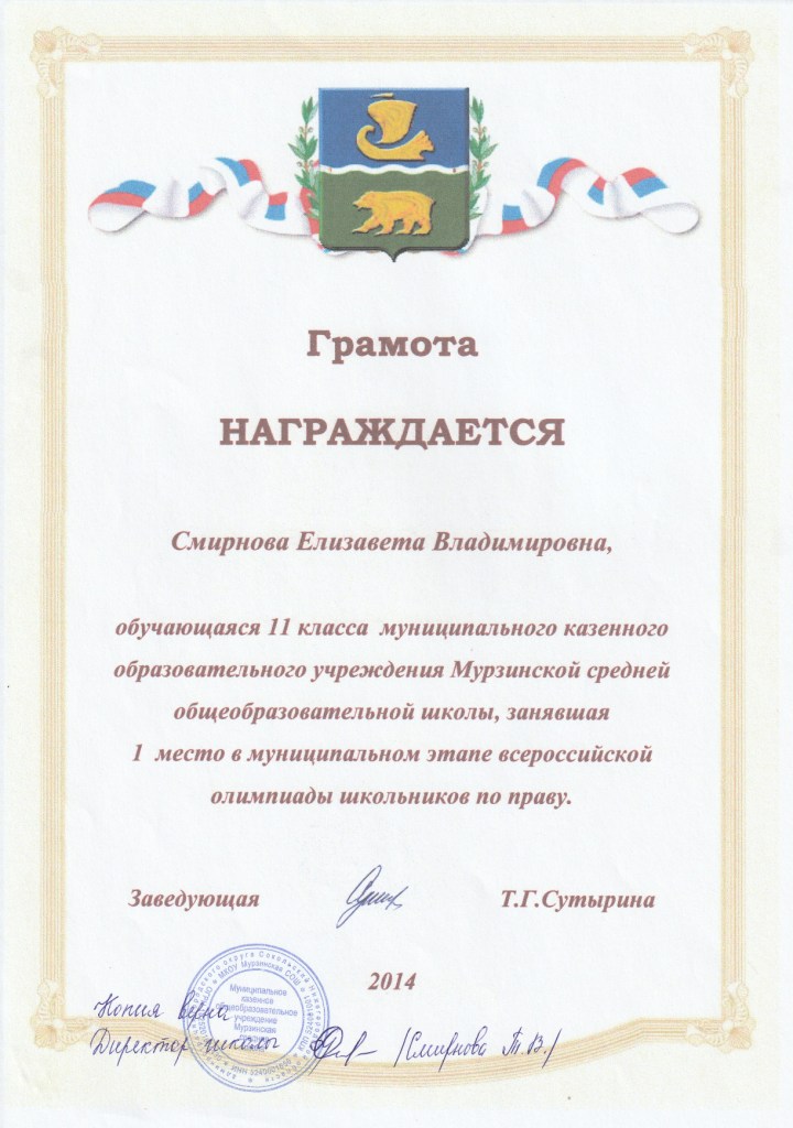 - Смирнова Елизавета (11 класс). 1 место в олимпиаде по праву.