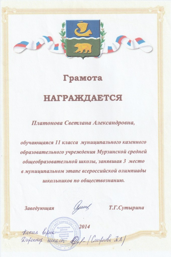 - Платонова Светлана (11 класс). 3 место в олимпиаде по обществознанию.