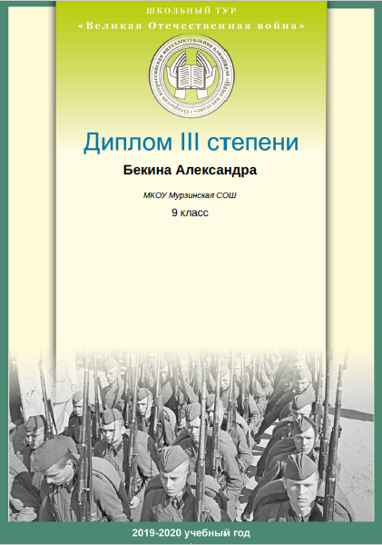 - Бекина Александра (9 класс). Диплом III степени международной олимпиады школьников "ОВИО "Наше наследие".