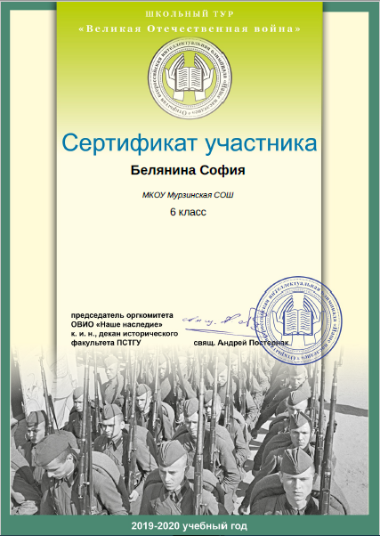 - Белянина София (6 класс). Сертификат участника международной олимпиады школьников "ОВИО "Наше наследие".