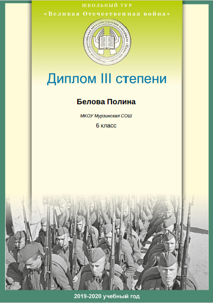 - Белова Полина (6 класс). Диплом III степени международной олимпиады школьников "ОВИО "Наше наследие".