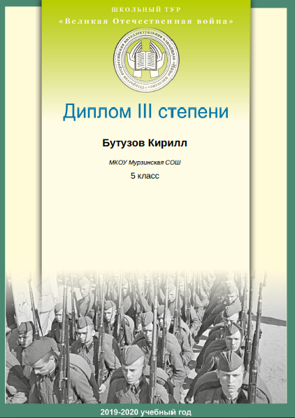 - Бутузов Кирилл (5 класс). Диплом III степени международной олимпиады школьников "ОВИО "Наше наследие".