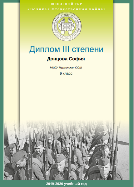 - Донцова София (9 класс). Диплом III степени международной олимпиады школьников "ОВИО "Наше наследие".