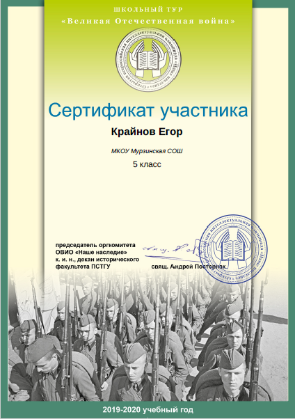 - Крайнов Егор (5 класс). Сертификат участника международной олимпиады школьников "ОВИО "Наше наследие".