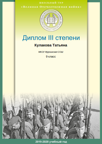 - Кулакова Татьяна (9 класс). Диплом III степени международной олимпиады школьников "ОВИО "Наше наследие".
