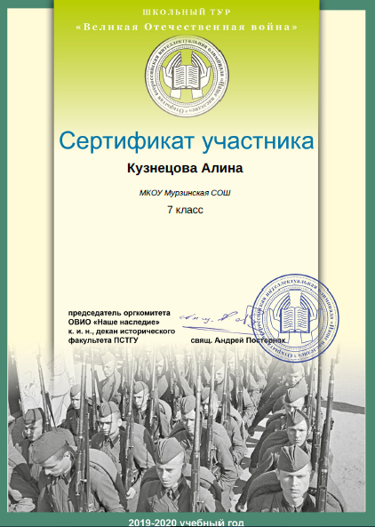 - Кузнецова Алина (7 класс). Сертификат участника международной олимпиады школьников "ОВИО "Наше наследие".