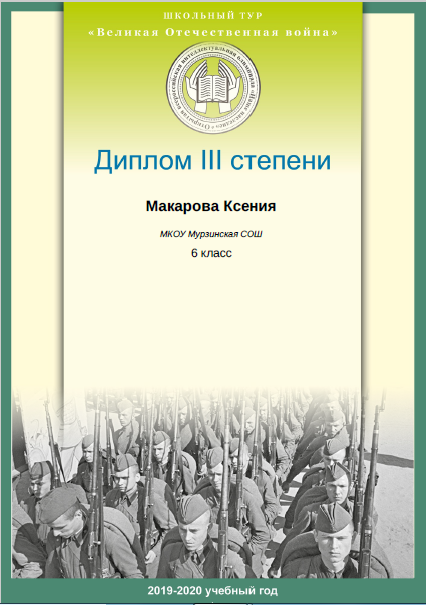 - Макарова Ксения (6 класс). Диплом III степени международной олимпиады школьников "ОВИО "Наше наследие".