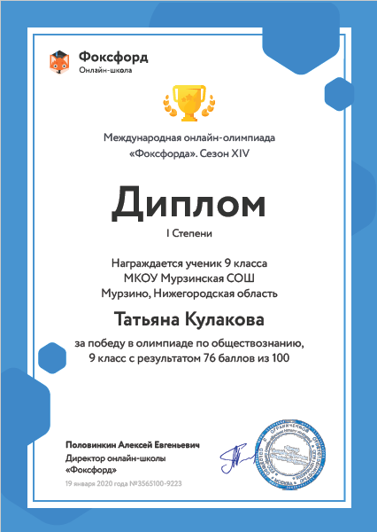 - Кулакова Татьяна (9 класс). Диплом I степени за победу в Международной онлайн - олимпиаде "Фоксфорда" по обществознанию.