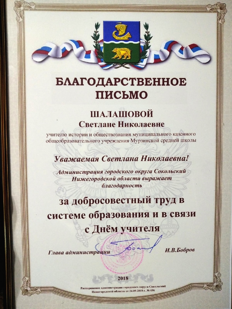 2018 год: Благодарственное письмо Администрации городского округа Сокольский за добросовестный труд в системе образования и с связи с Днем Учителя.