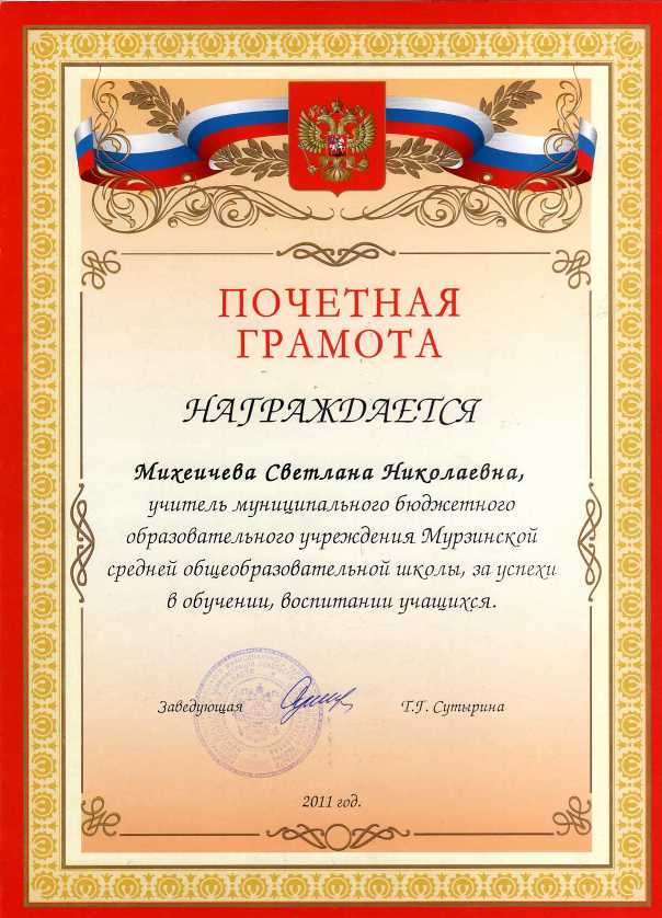 2011 год: Почетная грамота районного Отдела образования за успехи в обучении, воспитания учащихся.