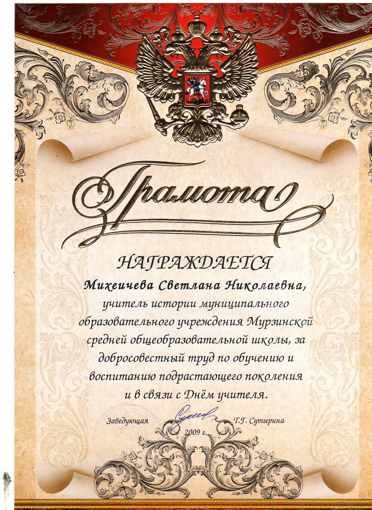 2009 год: Грамота районного Отдела образования за добросовестный труд по обучению и воспитанию подрастающего поколения и в связи с Днем учителя.