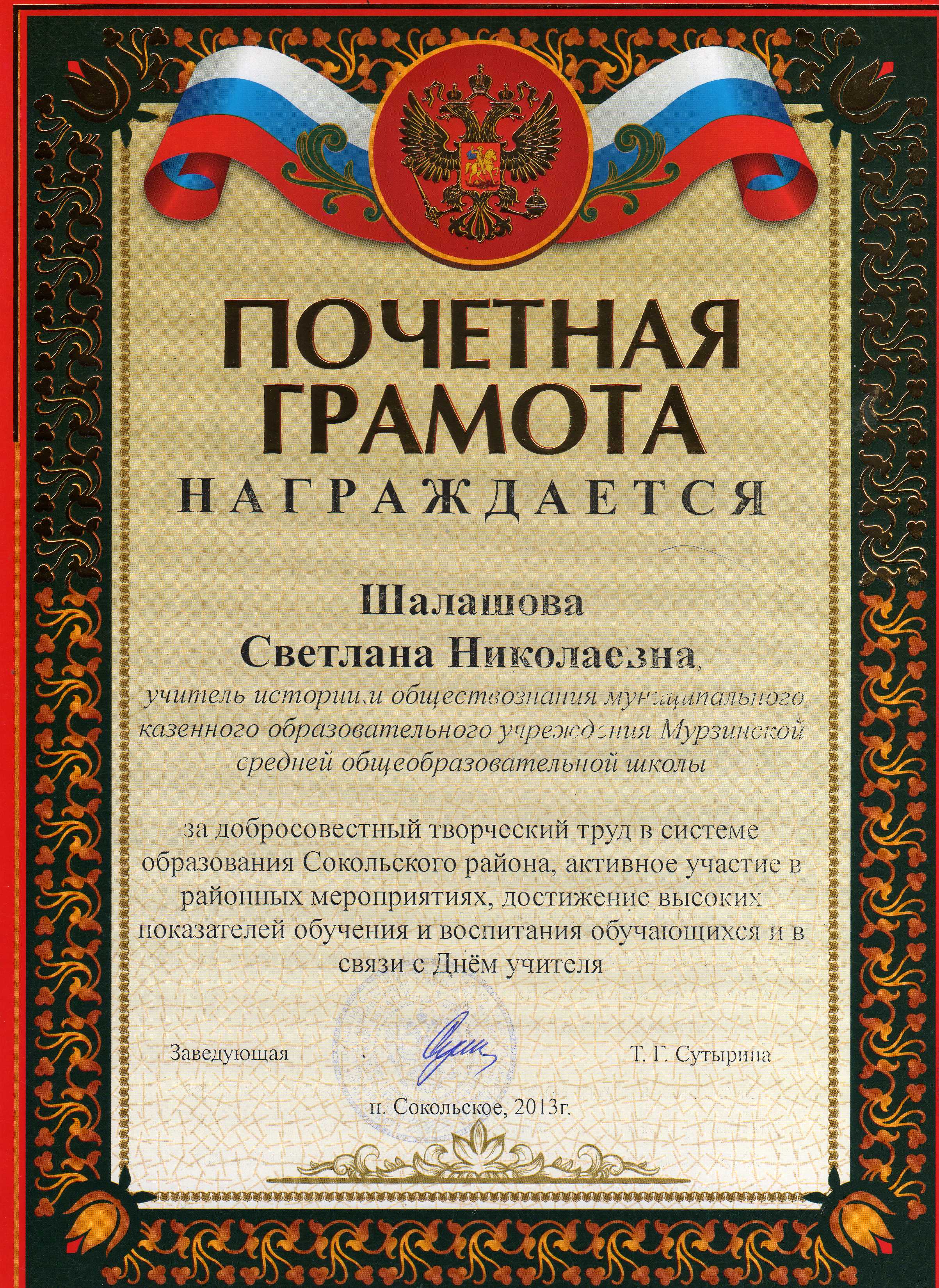 2013 год: Почетная грамота районного Отдела образования за добросовестный творческий труд в системе образования Сокольского района, активное участие в районных мероприятиях, достижение высоких показателей обучения и воспитания обучающихся и в связи с Днем учителя.