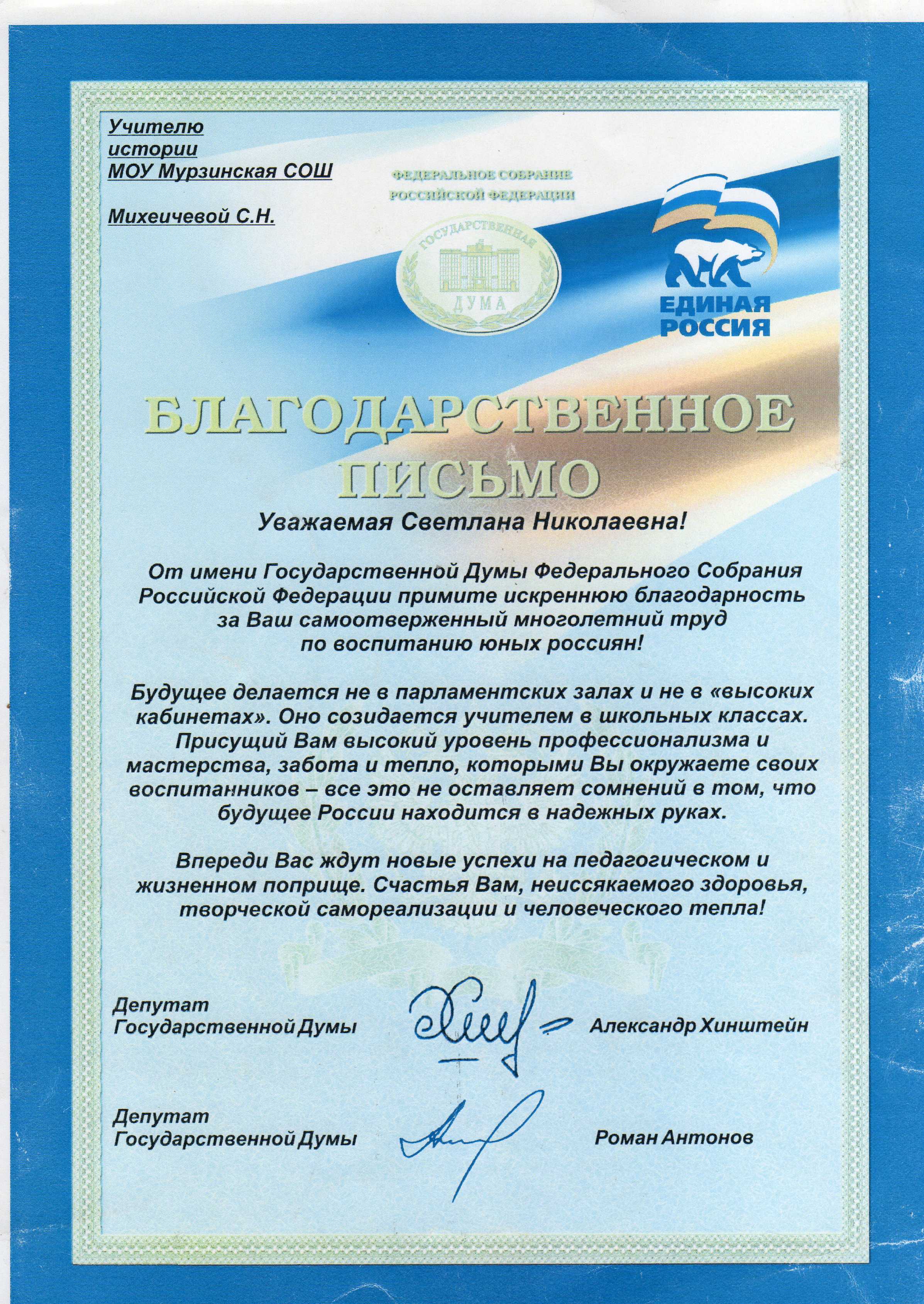 2010 год: Благодарственное письмо от имени Государственной Думы Федерального собрания РФ за самоотверженный многолетний труд по воспитанию юных россиян (Депутаты Александр Хинштейн и Роман Антонов).