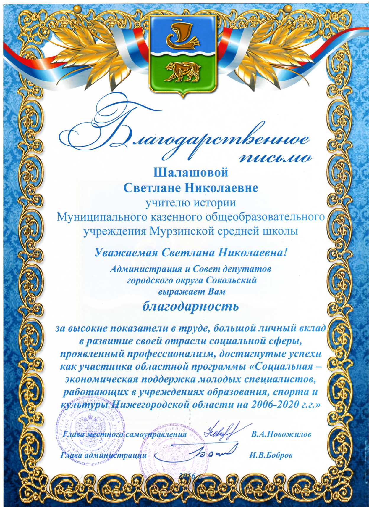 2016 год: Благодарственное письмо Администрации и Совета депутатов городского округа Сокольский за высокие показатели в труде, большой личный вклад в развитие своей отрасли социальной сферы, проявленный профессионализм, достигнутые успехи как участника областной программы "Социальная - экономическая поддержка молодых специалистов, работающих в учреждениях образования, спорта и культуры Нижегородской области на 2006 - 2020 гг.".