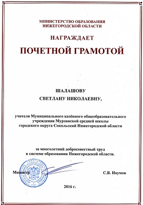 2016 год: Почетная грамота Министерства образования Нижегородской области за добросовестный труд в системе образования Нижегородской области.